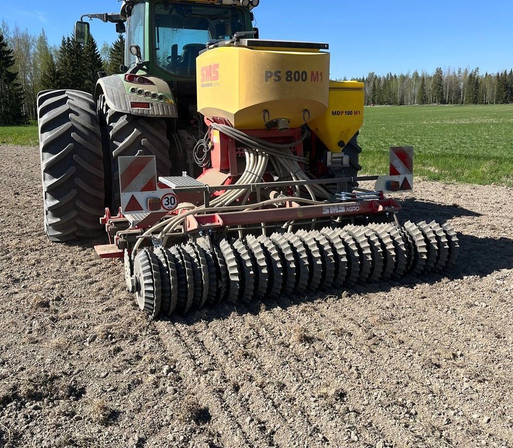 Kuvassa SMS Agro Smart Seeder 300 kylvökone APV PS 800 ja MDP 100 säiliöillä. Tractor Bumper 800 kg Safety Weight painopuskuri ja tarkasta kylvöstä vastaa Farmnavigator automaattiohjaus All in one RTK vastaanottimella ja korjaussignaalilla.