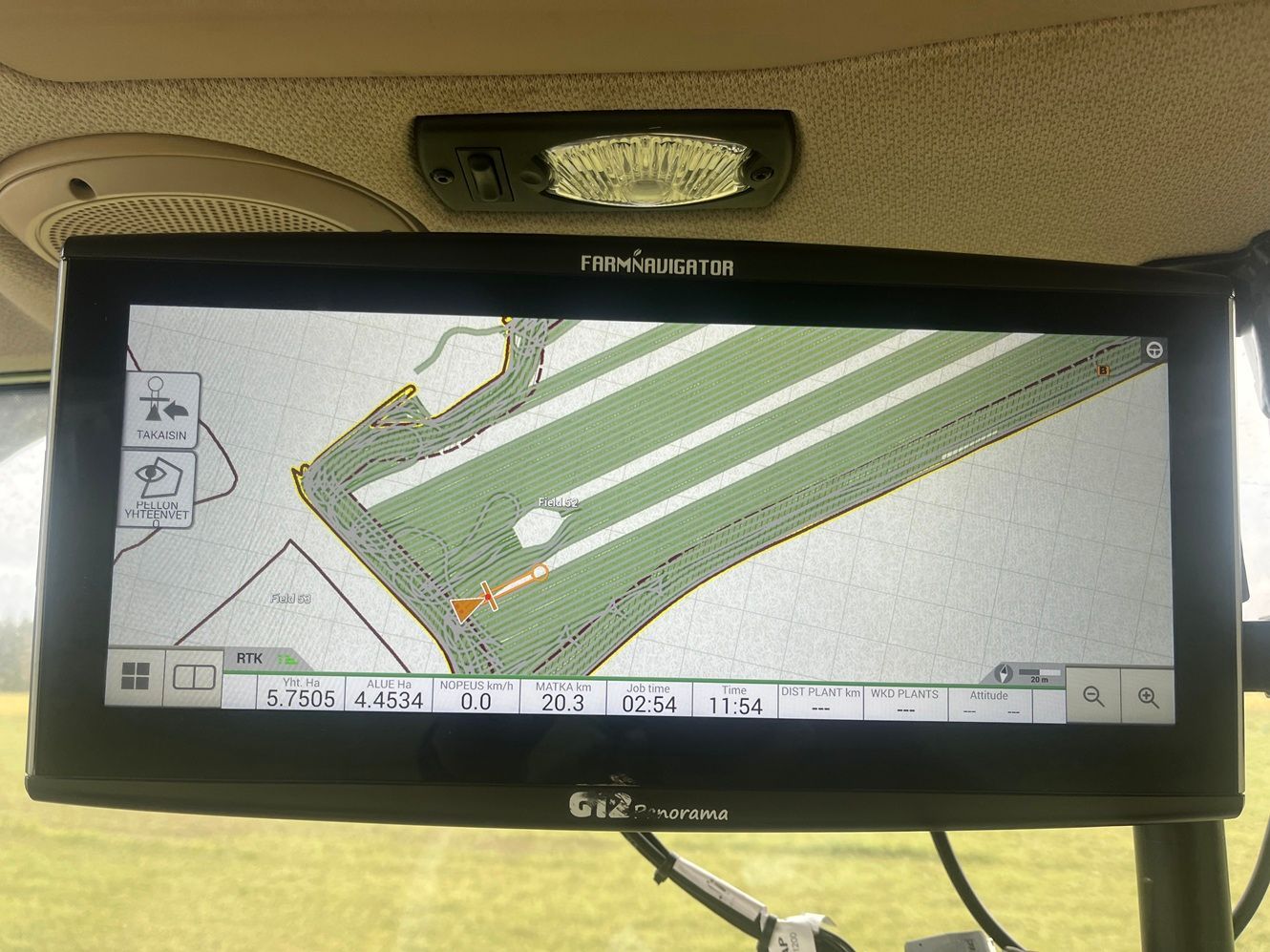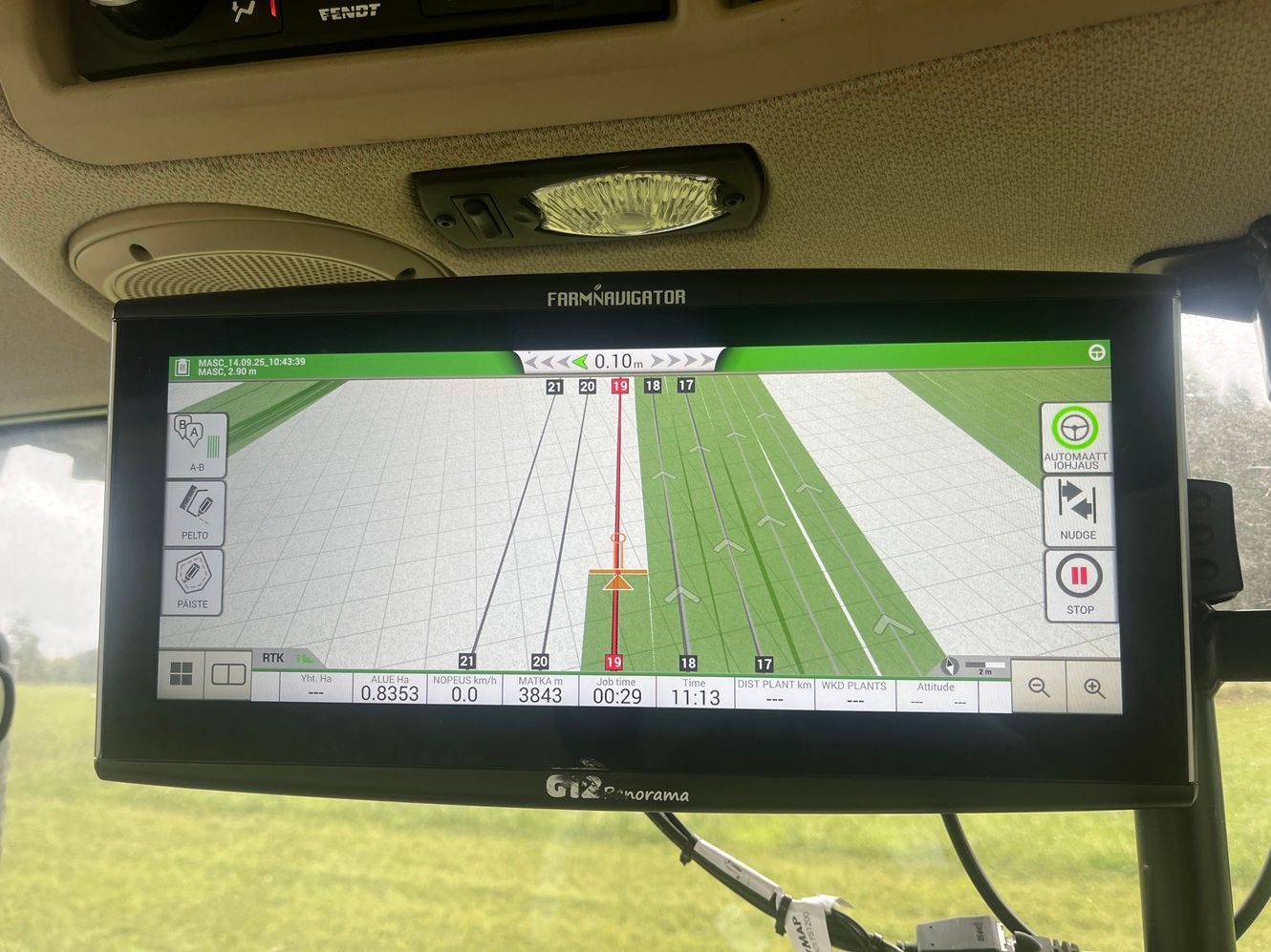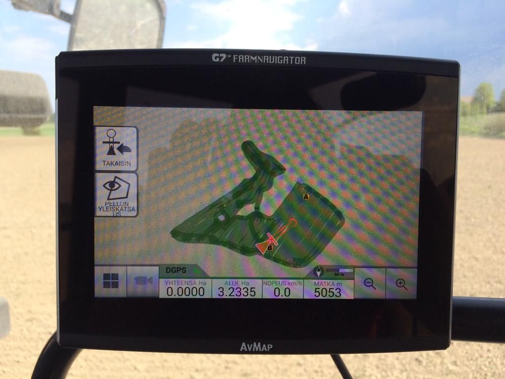 Voit kytkeä automaattiohjauksen pois pitämällä kiinni ohjauspyörästä. Voit kytkeä sen päälle painamalla kuvaketta Farmnavigatorin näytöllä tai kaukosäätimestä.
